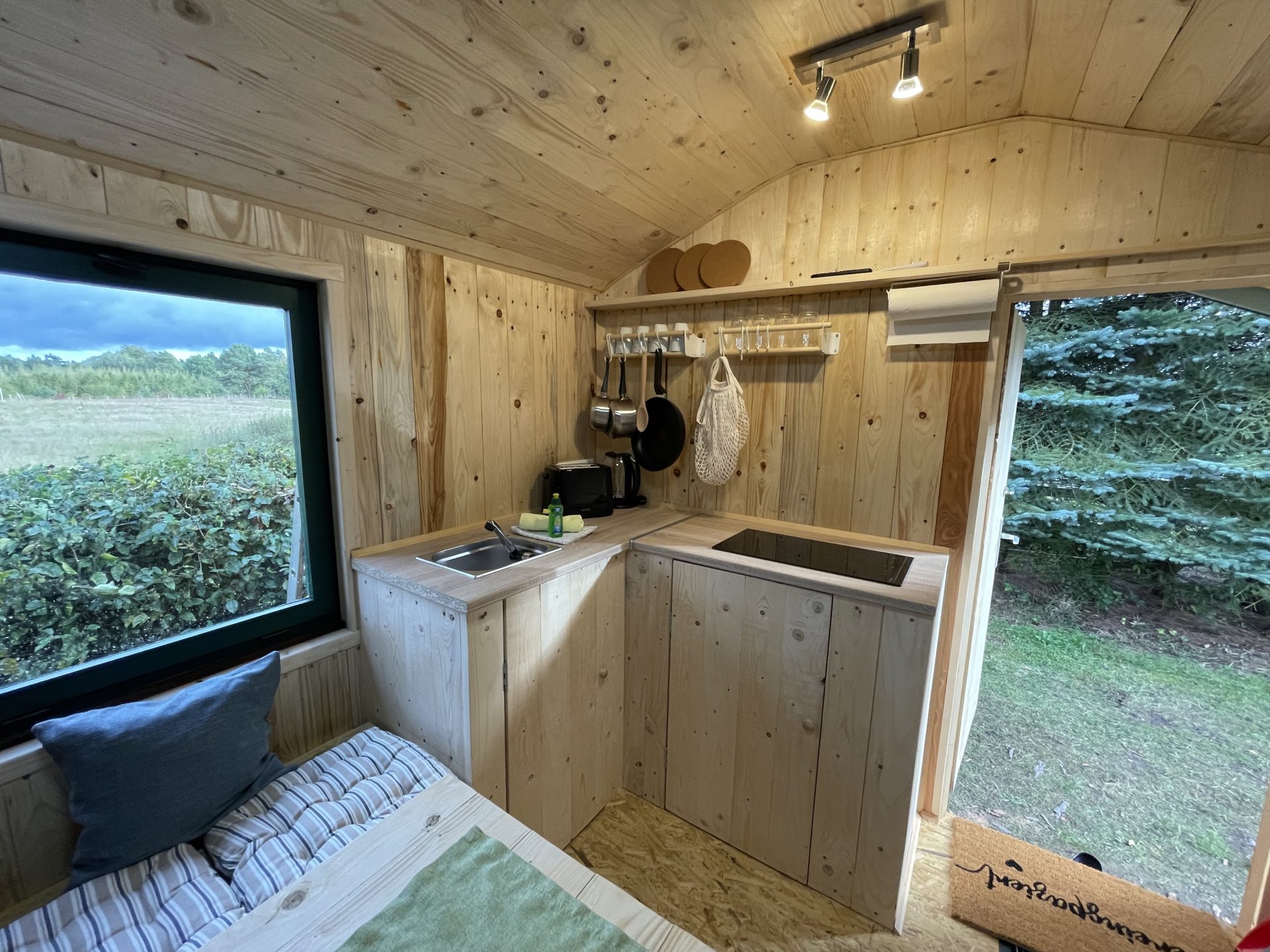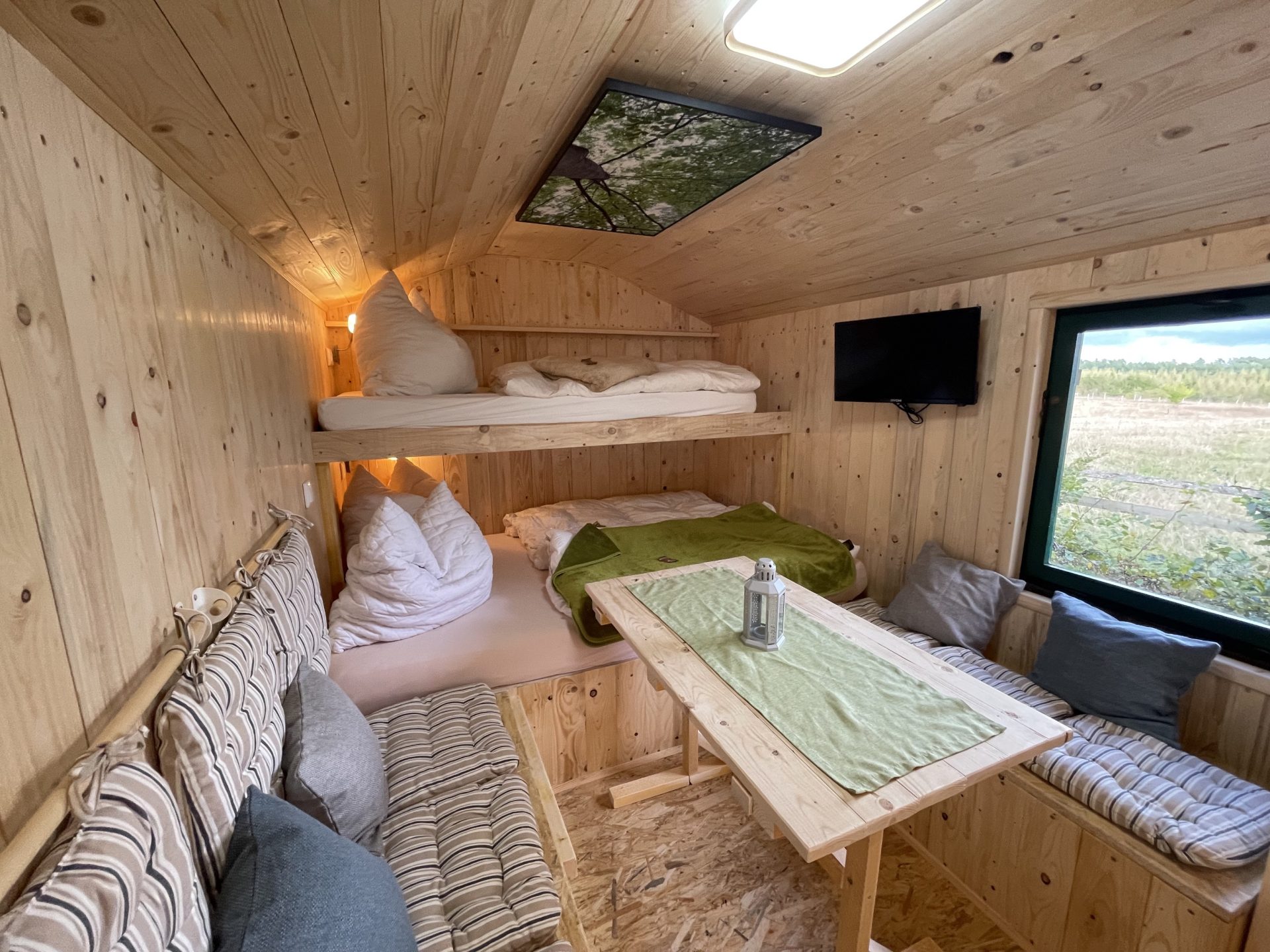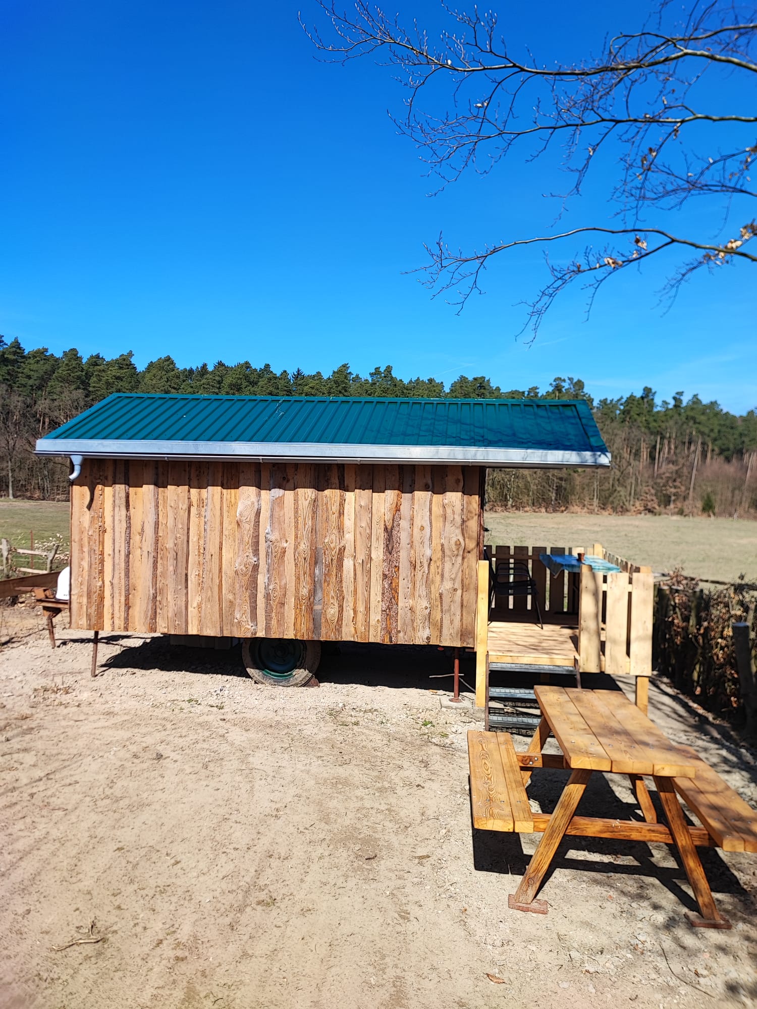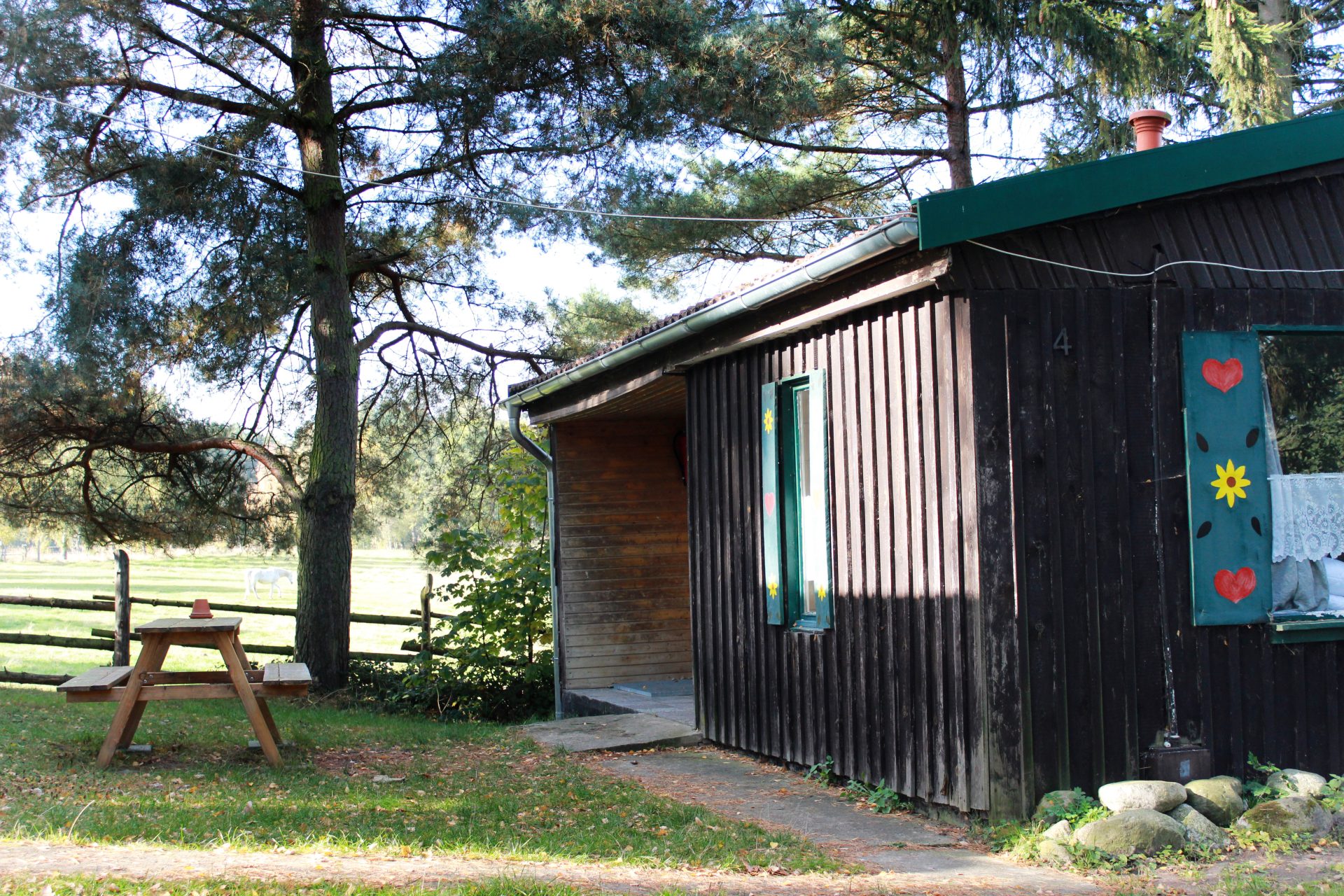 Die ehemalige Schutzhütte für Waldarbeiter steht nun umgebaut zum Tiny House am Rande unserer Weide, auf der die Pferde im Sommer und im Herbst grasen. Die rustikale Unterkunft hat 10 qm Fläche und kann bis zu vier Personen beherbergen (Bettenlänge 2,20 m). Der kleine Sitzbereich mit Sat-TV lädt zum Verweilen ein. Die kleine Küche ist ausgestattet mit Herdplatte mit zwei Kochfeldern, Kaffeemaschine, Wasserkocher, Toaster, Geschirr, Besteck, kleiner Kühlschrank und Wassertank. Eine kleine Campingtoilette steht im rustikalen Toilettenhäuschen hinter dem Tiny House bereit. Weiterhin können die Toiletten in der Waldstube und eine Dusche in einem separaten Gebäude genutzt werden. Vor der Unterkunft gibt es eine rustikale Sitzgruppe und einen PKW-Stellplatz. Für die Raucher steht ein Aschenbecher im Außenbereich zur Verfügung. Das Rauchen im Haus ist verboten.